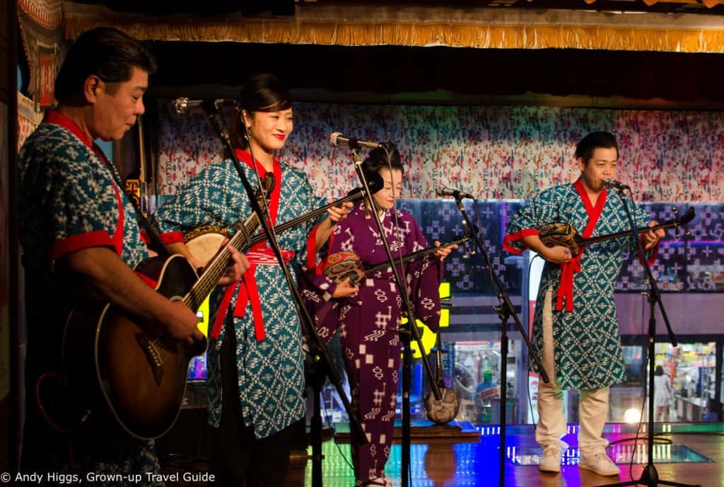 While we ate an excellent meal and sipped cool Orion beer we were serenaded by a colourful local troupe – including no less a celebrity than last year’s Miss Okinawa, Yui Uehara, on the sanshin (the banjo-like local instrument). I’ll leave it to you to work out which one she is in the photograph above, but it ought not to be too taxing…