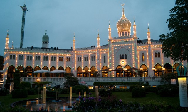 A family experience again. This time we were in the Danish capital and the major draw for our daughter was Tivoli – the grand old fairground which first opened in 1843 and is rather wonderfully located right in the centre of town next to the station. Unfortunately the weather had not been kind that day and the rain set in during the afternoon with no signs of slowing up as the evening came. We had semi-promised Rebecca that we would visit Tivoli that evening but personally I thought it might be worth trying to persuade her to give it a miss in favor of pizza and the hotel pool. Not a chance; so we got our wet weather gear on and took the bus into town in the pouring rain as darkness fell. If anything it began to rain even harder as we crossed the road and entered the fairground, but rather than spoil our enjoyment this actually added to it. The majority of sane people had stayed away so there were no queues to speak of and the slightly deserted – but fully manned – Tivoli has a special charm in the rain.