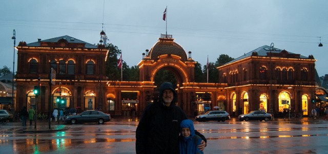A family experience again. This time we were in the Danish capital and the major draw for our daughter was Tivoli – the grand old fairground which first opened in 1843 and is rather wonderfully located right in the centre of town next to the station. Unfortunately the weather had not been kind that day and the rain set in during the afternoon with no signs of slowing up as the evening came. We had semi-promised Rebecca that we would visit Tivoli that evening but personally I thought it might be worth trying to persuade her to give it a miss in favor of pizza and the hotel pool. Not a chance; so we got our wet weather gear on and took the bus into town in the pouring rain as darkness fell. If anything it began to rain even harder as we crossed the road and entered the fairground, but rather than spoil our enjoyment this actually added to it. The majority of sane people had stayed away so there were no queues to speak of and the slightly deserted – but fully manned – Tivoli has a special charm in the rain.