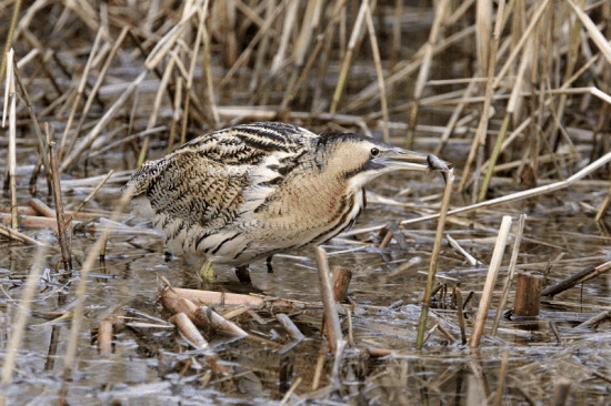 For further identification their eyes are an eerie yellow with a green or blue skin surrounding them. Their sound could easily be equated to a foghorn, deep and breathy. The bittern, like most birds, have different sounds for various reasons, from mating to danger calls.