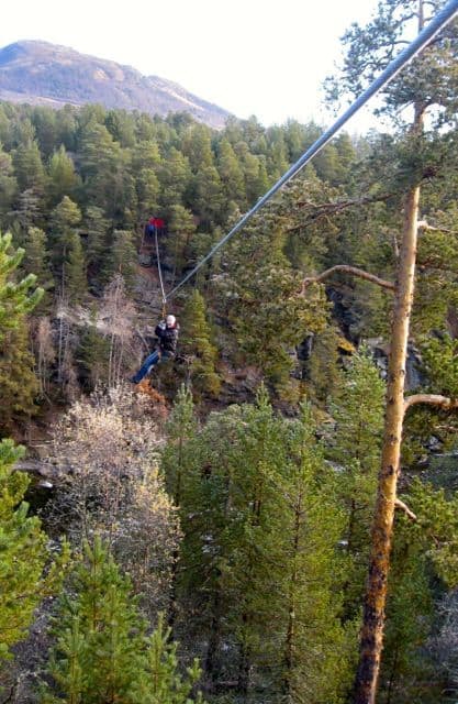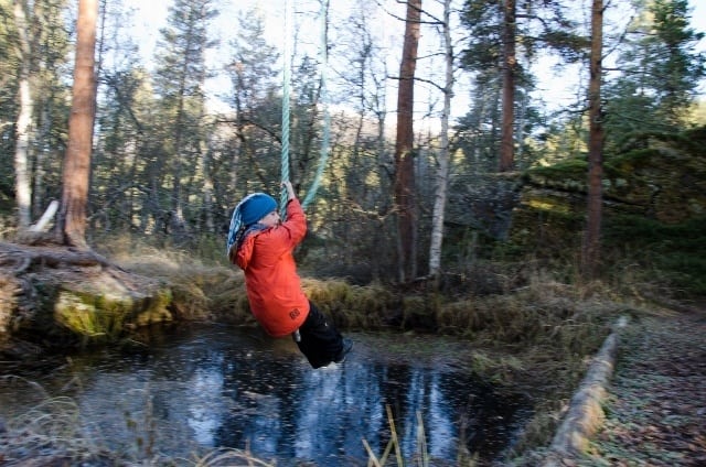 Opplev Oppdal offers a variety of challengers for companies hoping to improve teamwork among their employees, stag and hen night parties looking for something a little different or groups of schoolchildren. Flemming collected a bunch of harnesses from one of the cabins and I assumed we were going to be testing out a climbing wall a little later. The reality proved rather different, as you’ll soon find out. Rebecca couldn’t resist having a go on a rope swing over waist-deep water; fortunately she made it across with ease…