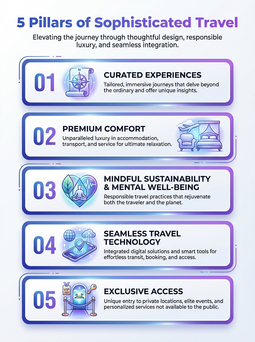 This infographic highlights the five pillars of sophisticated travel. It serves as a concise guide to planning more intentional, refined journeys.